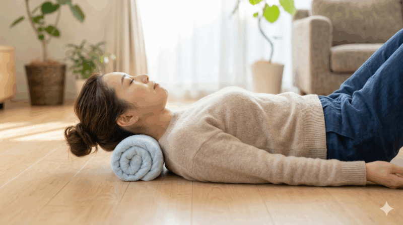 頭の重みを利用して首の後ろを優しく伸ばすことで、圧迫されていた神経や血管への負担を和らげる効果が期待できると言われています。高さが合わないと感じるときは、タオルの巻き具合で調整してくださいね。