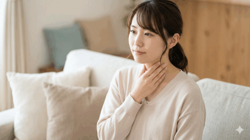 次に、首を優しく触ってみてください。 唾を飲み込むと動くような、コリコリしたしこりや腫れはありませんか? もし触れるものがあるなら、それはリンパ節が一時的に腫れているサインかもしれません。 喉がウイルスなどと戦っているときに、リンパ節が腫れて痛みが出ることがあると言われています。 この場合、首の外側を軽く押すと痛みを感じることが多いようです。 しこりの有無を触診してみることで、原因の絞り込みにつながります。