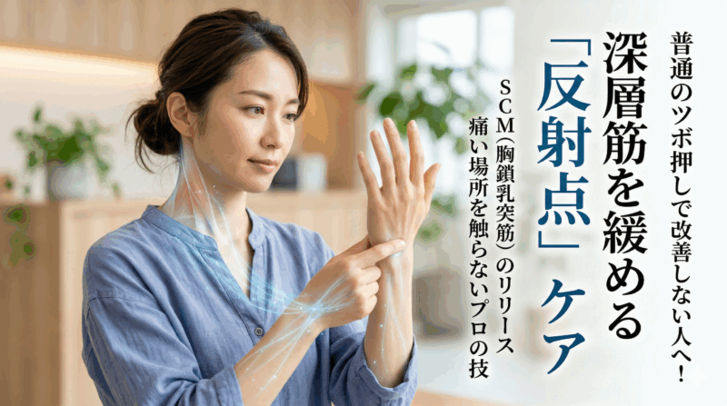 SCM(胸鎖乳突筋)のリリース:松本岐子先生が重視する、首の横の筋肉を緩めるためのツボ(腰痛点など)へのアプローチ。