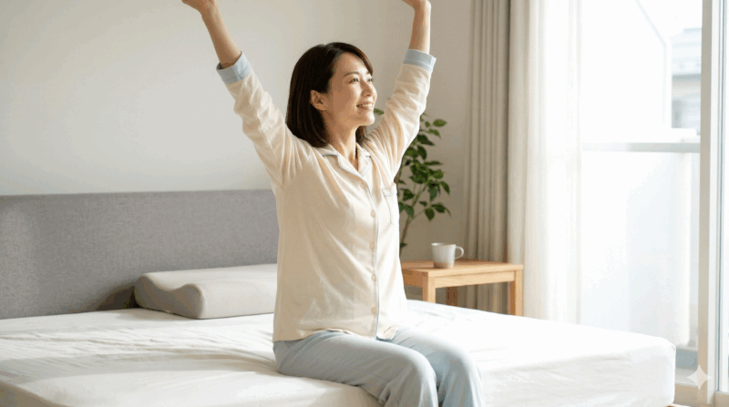また、両腕は体の脇にリラックスして置くことで、肩の力が抜け、筋肉が休まりやすい状態になると考えられています。 「仰向けは苦手…」という方も、枕の高さを調整するだけでぐっと楽になることもあるので、まずは一度試してみるのが良いかもしれません。
