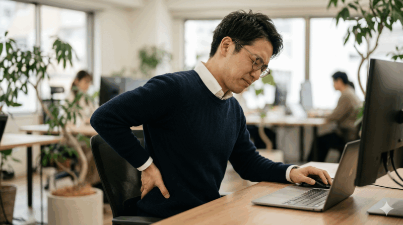 この筋肉、普段は私たちが立ったり座ったりする姿勢をキープするために、ずっと頑張ってくれているんです。でも、たとえば長時間のデスクワークや、ついつい夢中になってしまうスマホ操作で、ずっと前かがみの姿勢を続けているとどうなるでしょう? そう、脊柱起立筋は休む暇なく引っ張られ続け、過度な負担がかかってしまうわけです。その結果、筋肉への血流が悪くなり、酸素や栄養が十分に行き渡らなくなって、まるで硬いゴムのようにコリ固まってしまうのだとされています。