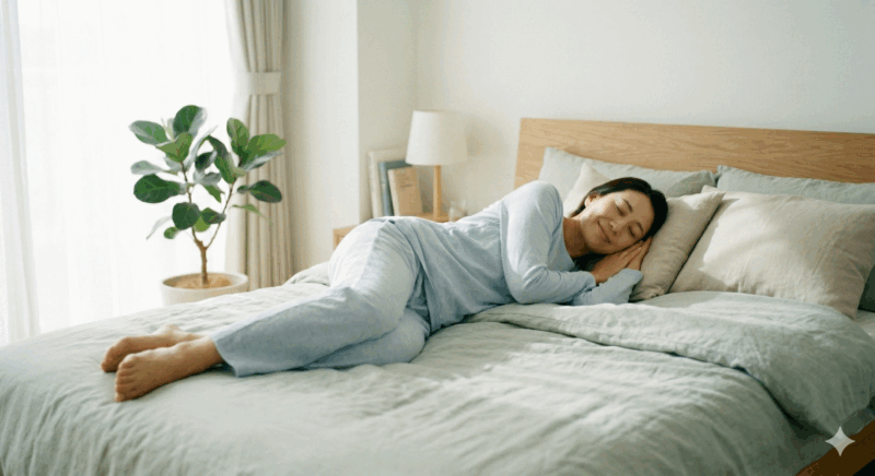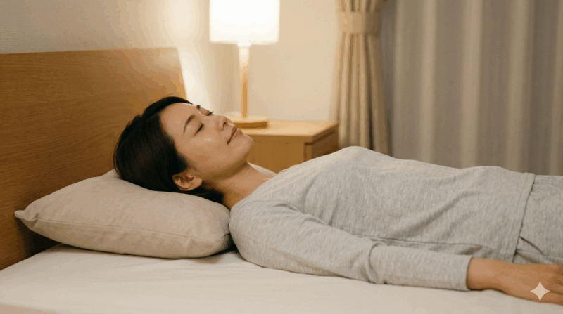 複雑な動きは一切ありません。布団の上に仰向けになり、体を重力から解放した状態で、首周りを心地よく伸ばす3ステップです。終わった後は、そのまま心地よい眠りに落ちてしまうかもしれません。