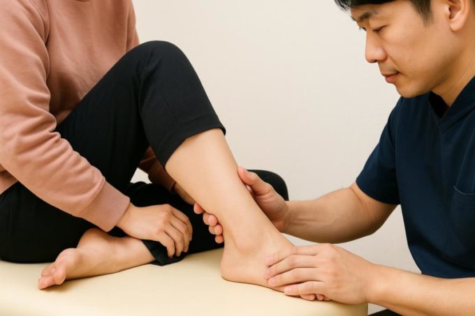 当院では、まず姿勢や歩き方をしっかり観察し、足関節・膝・骨盤までを総合的に評価する検査を行います。筋肉の過緊張だけでなく、関節の可動域や左右差のチェックも重要です。