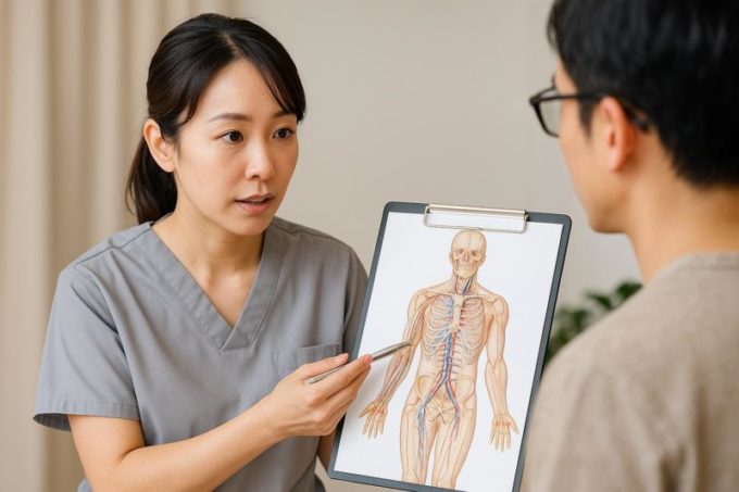 当院ではまず、来院された方の姿勢や呼吸の深さ、首や肩、背中の筋肉の硬さを丁寧に観察します。それに加え、脈のリズムやお腹の硬さ、手足の温度なども触診し、交感神経・副交感神経の働きの傾向を探ります。こうした細やかなチェックは、症状の背景にある原因を見極めるために欠かせない工程だと言われています。