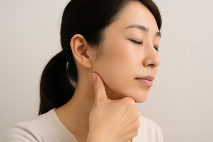 エラ張りの原因のひとつとされる咬筋(こうきん)は、自宅でも簡単にケアができると言われています。就寝前やリラックスした時間に、あごの横を指で軽く押し、円を描くように優しくほぐしてみましょう。強く押しすぎると逆に筋肉が緊張する可能性があるため、気持ちよい程度の力加減がおすすめです。