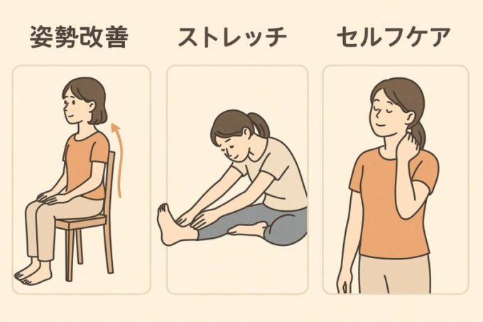 腰痛は筋肉の硬さから起こる場合も多いので、簡単なストレッチを習慣にするのもおすすめです。たとえば、もも裏を伸ばす前屈ストレッチや、お尻の筋肉を伸ばす動作は腰の負担を軽減しやすいと言われています。寝る前や起きたときに数分行うだけでも、筋肉の緊張がやわらぐ感覚が得られる方が多いです。