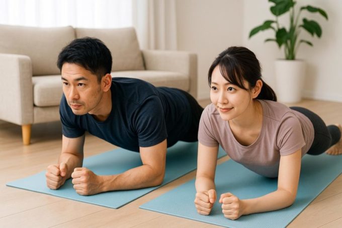 プランクは体幹トレーニングの定番とされる方法です。両肘とつま先で体を支え、背中からかかとまでを一直線に保ちます。30秒程度から始め、慣れてきたら時間を少しずつ延ばすのがよいとされています。お腹に力を入れて腰が反らないように意識することが大切です。