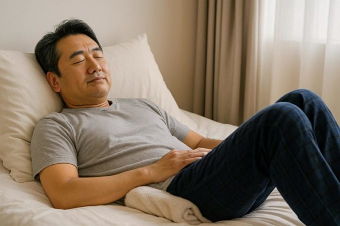 さらに、呼吸が浅くなりやすい人でも胸の圧迫が少し減り、呼吸がしやすくなることもあります。当院でも「眠りやすい」と感じてこの姿勢をとる方が一定数いらっしゃいます。