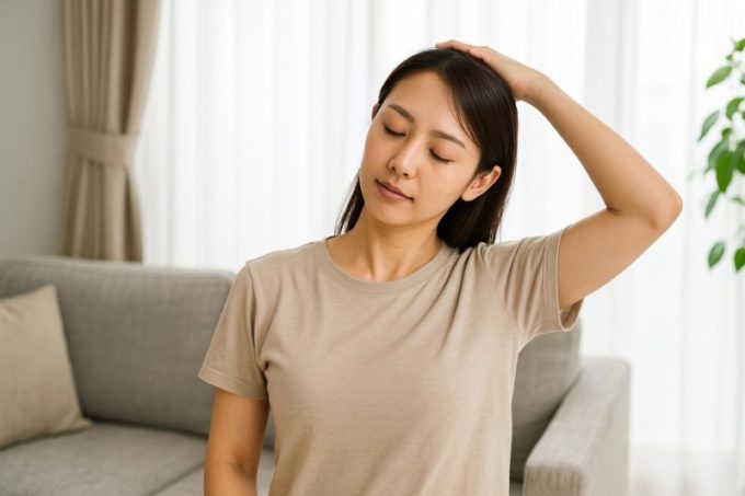 次に、セルフストレッチ&ケア。例えば肩甲骨を回す、手を上に挙げて肩を下げる、側頭部〜こめかみ近くの筋膜を軽くほぐす。こうした動きは血流を改善し、筋膜の引き締まりを和らげるのに有効と言われています。 kumanomi-seikotu.com+1 また、痛みが出そうな日は、蒸しタオルで首・肩を温めたり、こめかみを冷やしたりするのも得策です。実際、血管の拡張によるズキンズキンとした痛みの場合は冷却が、筋緊張や血流低下が原因の締め付けタイプの痛みには温めが有効だと言われています。 Starter Kit+1