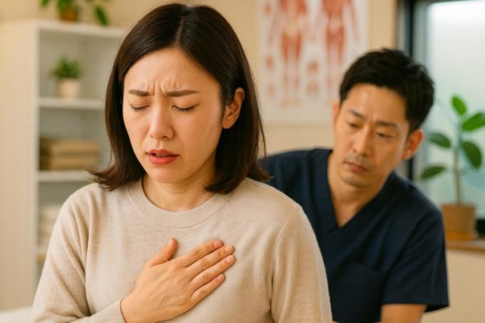 当院では、胸椎(背中の骨)や肋骨の動き、骨盤の傾き、肋間筋の硬さ、横隔膜の緊張などを細かく触診し、どこが負担の中心になっているかを確認するようにしています(。