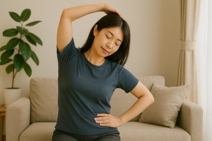椅子に座り、片手を頭の上に上げてゆっくり横へ倒すだけ。無理のない範囲でOKです。