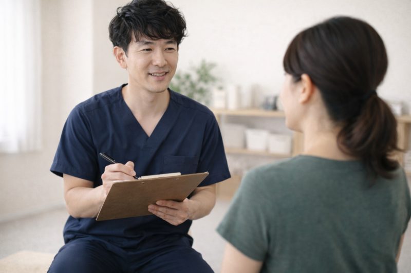 ひばりヶ丘にっこり鍼灸整骨院では、施術の際に骨盤の傾きや筋膜の張り、呼吸の状態を確認したうえで、「今日はこれを意識してみましょう」と個別にお伝えしています。