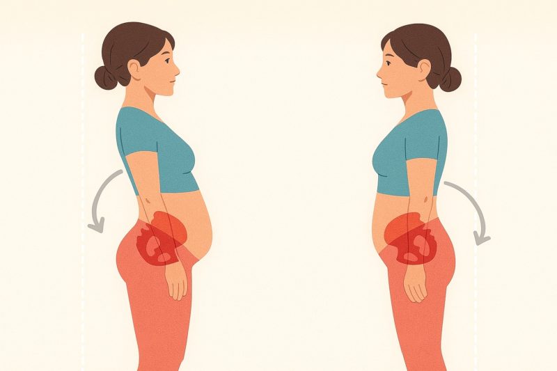 骨盤が前に傾く「骨盤前傾」の状態だと、腰が反りやすく、下腹が前へ押し出されるように見えるケースがあります。逆に、骨盤が後ろに倒れる「骨盤後傾」では、背中が丸まりやすく、腹部の筋肉がうまく働きにくいと言われていて、結果的に下腹のたるみにつながることもあるそうです。