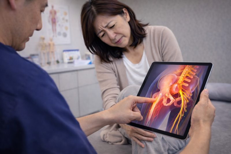 足がピリピリする場合、血流と神経の通り道を一緒に見ることが大切だとされています。当院では、腰から足先までの動きや緊張を確認し、神経が通りづらくなっていないかを触診で評価します。これは、更年期世代で見られやすい自律神経の影響も踏まえた視点です。