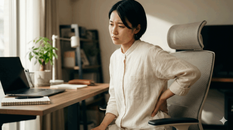 「仕事が終わる頃には腰がガチガチ…」「夕方になると、座っているのが辛い」そんな風に感じること、ありませんか?長時間座っていると、腰の筋肉が固まってしまい、どうしても痛みが出やすくなってしまうものです。 参考記事によると、座っている時に腰が痛くなる主な理由は、大きく分けて「長時間の同じ姿勢による負担」と「姿勢の悪さ(骨盤の倒れ)」の2つだと言われています。