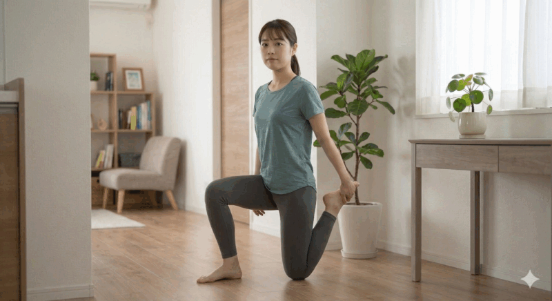 次にご紹介するのは、反り腰の方に特におすすめの、前ももを伸ばすストレッチです。反り腰になると、重心が前にズレるため、前ももの筋肉「大腿四頭筋」が常に張ってしまいがちです。このストレッチで、前ももの張りを取って、脚のラインを真っ直ぐに近づける効果が期待されています。