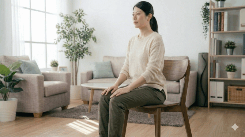 椅子に浅く腰掛け、背筋を伸ばします。