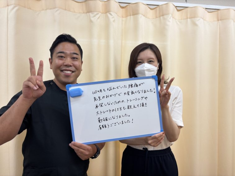 何か月も悩んでいた腰痛が先生のおかげで大変良くなりました!再発しないためのトレーニングやストレッチの仕方も教えて頂き勉強になりました。有難うございました!