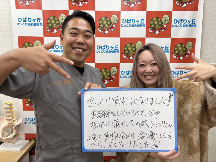 ぎっくり背中よくなりました!美容師をしているので年中背中が痛かったのですが、にっこりさんに来て、原因も分かり治療してもらったらよくなりました✌